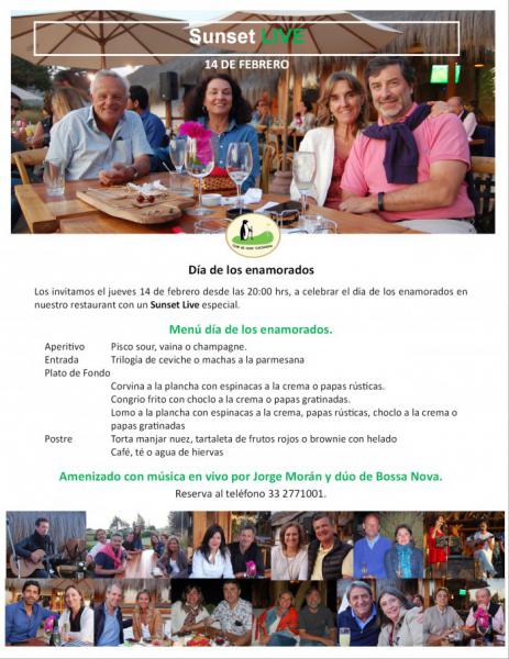 Los invitamos el jueves 14 de febrero desde las 20:00 hrs, a celebrar el día de los enamorados en nuestro restaurant con un Sunset Live especial.