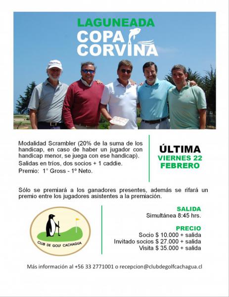 Los invitamos a la Última Copa Corvina el vienres 22 de febrero, con lagueada. Modalidad Scrambled (20% de la suma de los handicap, en caso de haber un jugador con handicap menor, se juega con ese handicap).
